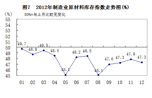 2012年,原材料库存指数高点出现在1月为49.7%,随后一路下行,5月跌至年内低点45.1%,之后6、7月回升,8月又跌至年内低点45.1%,9-12月在47%-48% 的箱体间波动,该指数全年均在临界点以下运行,总体呈W型走势。2012年原材料库存指数均值为47.7%,低于历史均值0.4个百分点,高于历史低点1.3个百分点,低于历史高点2个百分点。从历史数据看,我国制造业原材料库存大部分时间处于较低水平,尤其是受经济下行的影响,2012年更是创下近3年的新低。