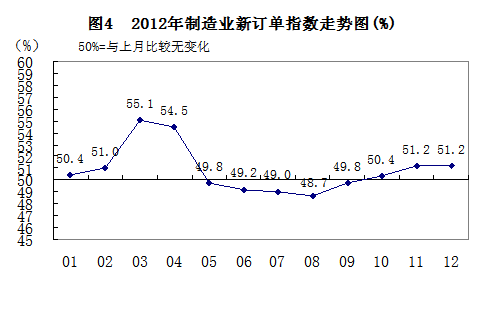 2012年,构成制造业PMI的5个分类指数中,均值低于临界点的有从业人员指数49.4%、供应商配送时间指数49.5%和原材料库存指数47.7%,均值高于临界点的是新订单指数50.9%和生产指数53.0%,其中生产指数均值最高,高出PMI综合指数均值2.1个百分点,是PMI综合指数均值站在临界点以上的主要拉动力量。