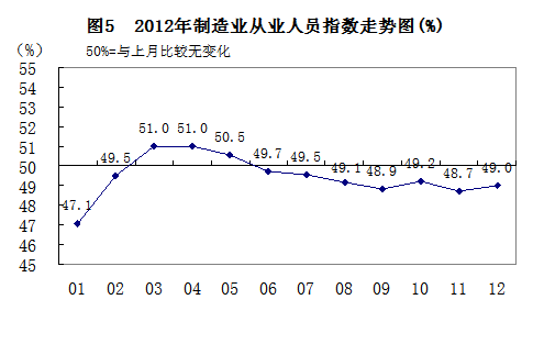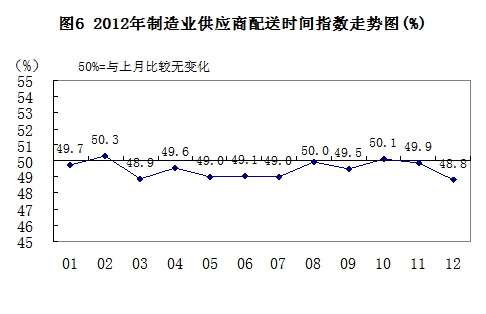2012年,从业人员指数只有3、4和5月位于临界点以上,其余各月均位于临界点以下,尤其是6月跌至临界点以下后,再也没能重返临界点以上。2012年从业人员指数均值为49.4%,低于历史均值1个百分点,低于2011年0.8个百分点,为历史次低点。从历史数据看,从业人员指数走势与生产和新订单基本一致,但是变化幅度要小得多,表明我国制造业企业用工量扩张速度在减缓,但降速并不明显;2012的下半年,该指数始终围绕49%上下波动,没有明显回升的迹象年,表明近期制造业用工量快速上升动能不足。