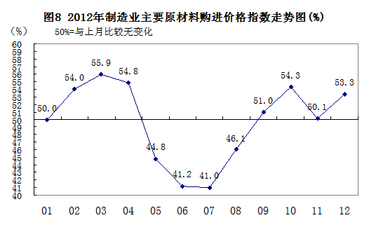 2012年,主要原材料购进价格指数1月位于临界点,3月升至年内高点55.9%,随后逐月下行,4-7月连续4个月位于临界点以下,7月降至42个月以来的新低41.0%,9-12月在50%以上波动,该指数全年呈现两头高,中间低的大幅波动走势。2012年原材料购进价格指数均值为49.7%,低于2011年8.5个百分点,低于历史均值8.2个百分点,低于历史高点13.9个百分点。从历史数据看,原材料购进价格指数呈M型走势,表明我国原材料购进价格波动较大,尤其是进入2012年以来,在新一轮全球宽松货币政策和世界经济不确定因素增加的叠加影响下,国际大宗商品价格跌宕起伏,助推了我国原材料采购价格的大幅波动。