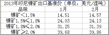 印尼贸易部于1月末公布二月镍矿出口基价,根据品位不同,价格基本在14.57美元/吨-39.86美元/吨之间,较1月出口基价环比调高0.41-0.45%。详细如下表: