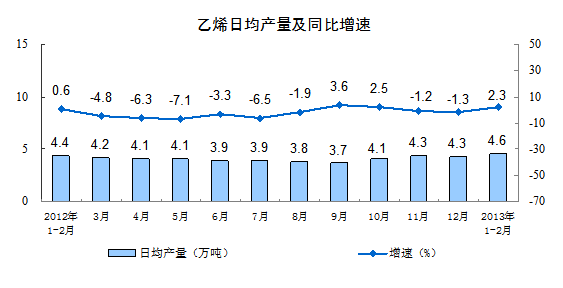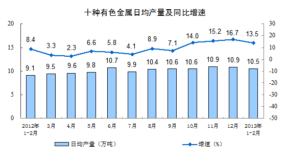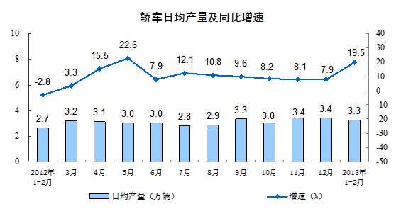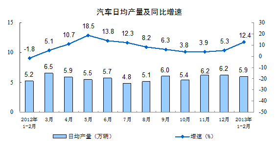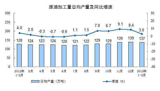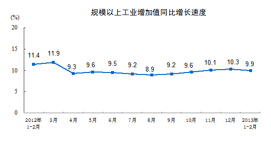 | 2013年1-2月份,规模以上工业增加值同比实际增长9.9%(以下增加值增速均为扣除价格因素的实际增长率),比2012年12月份回落0.4个百分点。从环比看,2月份,规模以上工业增加值比上月增长0.79%。