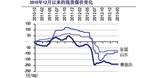 2010年12月以来的现货煤价一路下跌,为电煤并轨创造了机会。数据来源:中国煤炭资源网