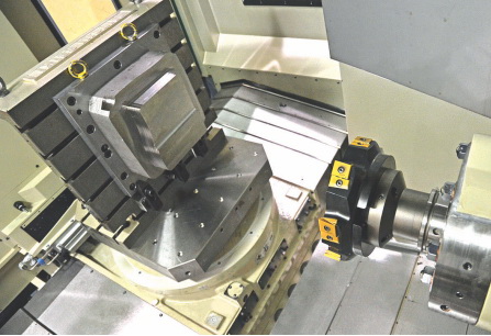 FBI钻在钛材料工件上钻了一个平底孔,在主轴速度为102 min-1,进给率为10.2毫米/分钟,孔径为125毫米条件下,金属切除率为125.2立方厘米/分钟。在钻完第一个孔后,将工件在主轴上旋转一个45度角,又钻出一个斜钻孔,斜钻孔穿过第一个孔的钻孔边缘处。尽管加工过程为严重断续切削,机床和钻头都表现出良好的性能。