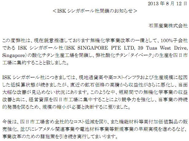 8月12日,日本石原产业株式会社(ISK)宣布将关停位于新加坡的钛白粉厂,将其并入日本四日市的钛白粉厂。