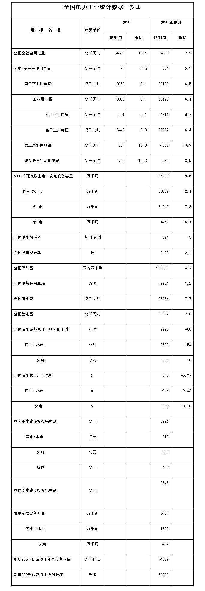 1-9月,全国全社会用电量累计39452亿千瓦时,同比增长7.2%。分产业看,第一产业用电量776亿千瓦时,同比增长0.1%;第二产业用电量28689亿千瓦时,增长6.5%;第三产业用电量4758亿千瓦时,增长10.9%;城乡居民生活用电量5230亿千瓦时,增长8.9%。