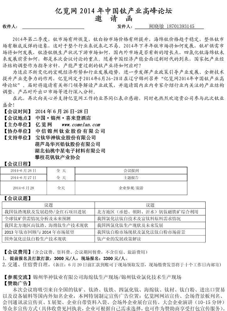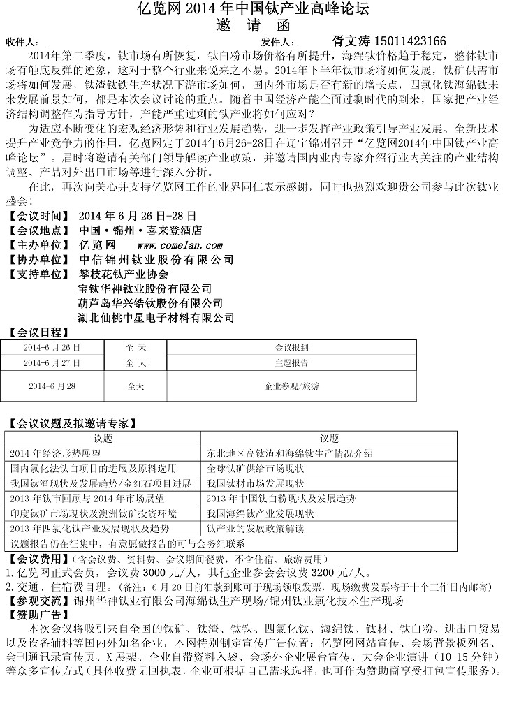 2014年亿览网中国钛产业高峰论坛邀请函