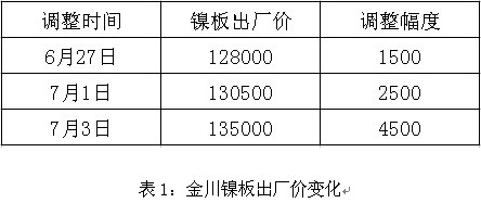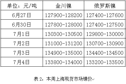 本周外盘有两日收盘上涨幅度较大,金川公司跟随调整镍板出厂价,本周现累计上调7000元/吨。
