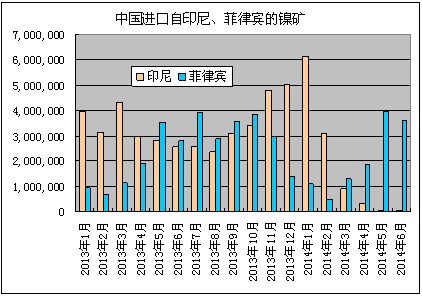 海关数据显示,6月份中国进口镍矿及镍矿砂366.33万吨。其中,从菲律宾进口镍矿石359.91万吨,环比上月减少约9.6%,相对2013年12月-2014年4月月度进口量仍维持在高位,同比2013年6月份则大增28.7%。由于菲律宾巴拉望、三描礼士等地区已陆续进入雨季,镍矿出货量减少,但苏里高地区将维持较高出货量,预计未来7-8月国内进口自菲律宾的镍矿将维持在高位,不会出现大幅增加的情况。同时数据还显示,6月进口自印尼的镍矿石为4.04万吨,目前印尼仍在严格执行其镍矿出口禁令,未有松动迹象,最近两月进口量多由报关延迟等原因所致。