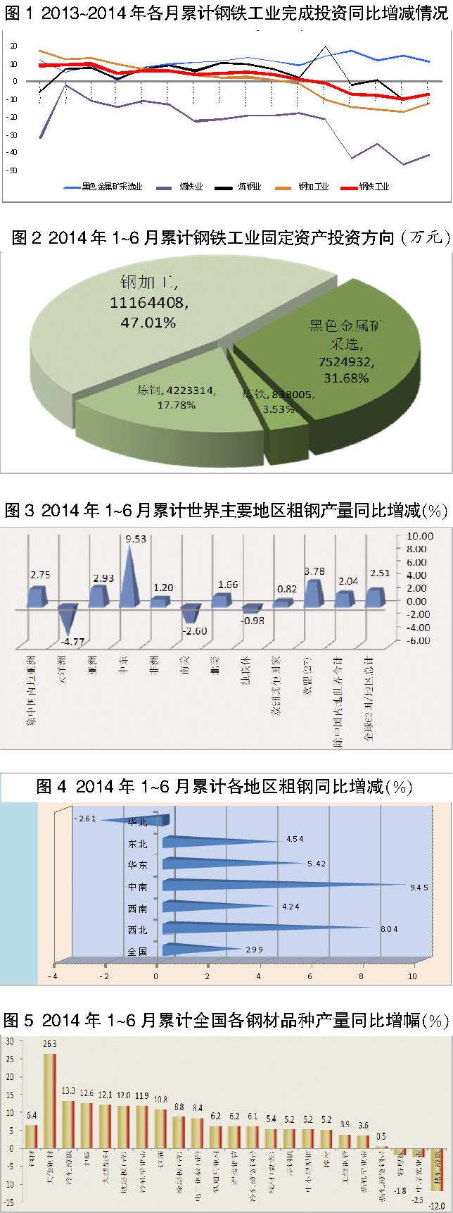 2014年上半年,中国内地钢铁生产继续稳定增长,但同比增速明显回落,粗钢日产水平不断创新高,粗钢产量占世界钢产量的比重达到50.15%。会员企业产量增幅小于其他企业。分地区来看,西北和中南地区同比增速进一步提高,华北和西南地区同比增速大幅回落。江苏和辽宁省同比大量增产,河北省减产最多。同时,随着化解过剩产能工作的逐步开展,钢铁投资进一步萎缩,新开工项目大幅减少,钢加工、炼钢、炼铁投资比重进一步下降,投资方向进一步向矿山投资集中。