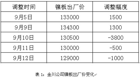 周内外盘连续大幅波动,金川公司连日调整镍板出厂价,累计下调4300元/吨。