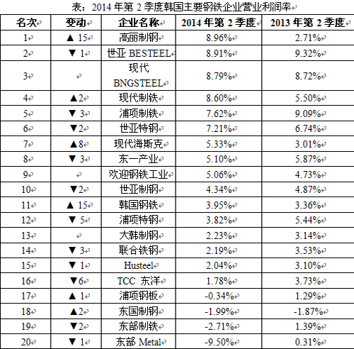 依照韩国财务报告准则(K-IFRS),今年第2季度其他主要公司的营业利润率情况分别是:浦项制铁的营业利润率为7.62%,同比减少了1.47%,位列第5,世亚特钢位列第6,同比小幅增长。随后依次是现代海斯克、东一产业、欢迎钢铁工业,营业利润率均为5%左右,世亚制钢为4.34%,同比下滑了2位。位列第10。