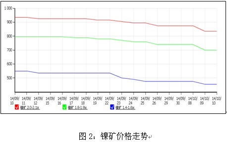 持续低迷的镍市行情令镍矿市场毫无起色,本周中高品味的镍矿价格持续走弱,NI:1.8-1.9品位的镍矿价格本周累计下跌约40元/湿吨,低品位镍矿价格弱势持稳,由于镍铁价格不断的下跌,部分厂家甚至出现倒挂现象,不轻易采购原料,令镍矿价格失去支撑,且本周库存依旧小幅增加,都压制了矿价,预计下周镍矿价格依旧弱势运行,甚至持续下跌,矿商谨慎操作。