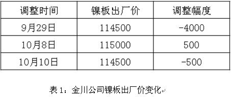 外盘大致持震荡走势,因国庆长假,金川节后才开始调整出厂价,两次调整后,较上周镍板出厂价无变化。