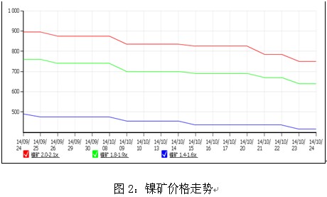 本周镍矿价格跌势明显,呈现不断下行的趋势,NI:1.8-1.9%的镍矿均价由上周的690元/湿吨跌至目前的640元/湿吨,累计下跌50元/湿吨,低品位镍矿价格弱势持稳,由于镍铁价格持续大跌,厂家采购原材料极少,镍矿询盘及报盘寥寥无几市场极其冷清,大多的矿商也表示后市行情难料,操作大都较谨慎,观望居多,预计下周镍矿价格继续持小幅下跌走势。
