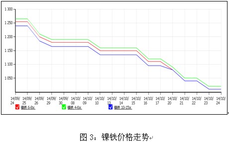 由于市场担忧经济仍存下行的压力,以及供需失调影响下,镍市行情持续疲弱,本周镍铁价格进一步下跌且幅度有所加大,10-15%品味的高镍铁均价由上周的1095元/镍下跌至目前的1010元/镍,累计下跌85元/镍,截至周五高镍铁的主流出厂价为1000-1020元/镍,其它品味的镍铁价格亦如此,据市场了解,目前镍铁厂家因无利润空间被迫无奈选择停产开工率较前期大幅降低,目前镍铁价格没有止跌的迹象,预计下周或将延续跌势行情。 |