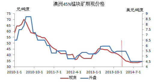 2014年前三季度,进口锰矿现货与外盘持续倒挂,中间流通大多集中在具备进口资质的大型冶炼厂及国有大型贸易商,中小型贸易商逐步减少甚至退出市场,价格倒挂的形成,一方面国内铁价持续下降对锰矿现货形成持续利空,另一方面则体现为国外处于相对垄断地位的供矿商报盘相对坚挺。即使外盘价格在上半年已经出现明显下调,但相对硅锰合金降幅,显然下调力度远远不够,国外矿山拥有着成本优势,价格下调空间依然存在,南非矿山的开采力度以及对华市场争夺将进一步加大锰矿外盘水平的下移。