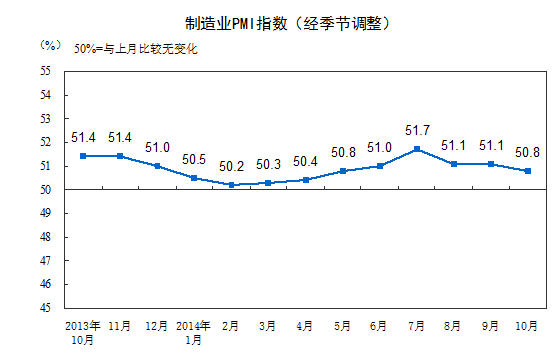 2014年10月,中国制造业采购经理指数(PMI)为50.8%,虽比上月回落0.3个百分点,但仍高于临界点,表明我国制造业总体上继续保持平稳增长态势。