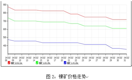 本周前半周各个品味镍矿价格均呈现下跌趋势,NI:0.9-1.1品位的镍矿价格本周累计下跌30元/湿吨,由于收到铁矿石的影响,低品位价格受到冲击,因为持续下跌,中高品位的镍矿价格本周累计下跌约30元/湿吨,后半周随着外盘伦镍的反弹,镍矿价格暂止跌企稳,据了解,目前市场较混乱,成交也不是很好,业内人士仍不看好后市,料后期还将有小幅下滑的空间。商家谨慎操作。