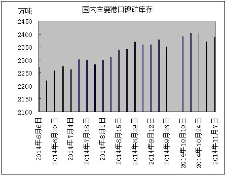统计的天津港、连云港、岚山港等港口数据显示,11月初国内主要港口镍矿库存为2389万吨以下,较10月底的2372万吨有所回升,但仍维持在2400万吨以下。其中,菲律宾镍矿为1614万吨,印尼镍矿为775万吨,库存量较大的港口分别为连云港、天津港、岚山港等。