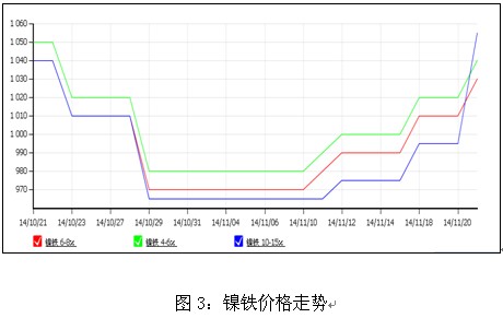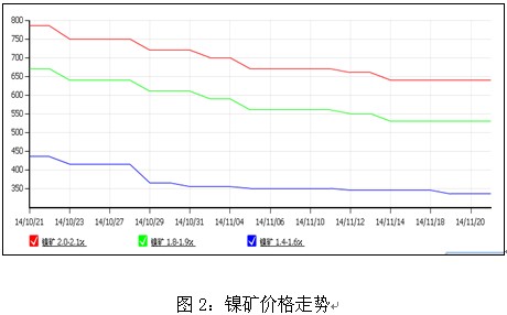 从图可以看出,本周镍矿的价格整体波动不大,各个品位的镍矿价格下调10元/湿吨,由于铁矿的价格持续弱势格局,因此低品位的镍矿受此影响无人问津,且价格阴跌,本周累计下跌约10元/湿吨,中高品味的镍矿价格也同样如此,但是由于本周伦镍的走好,镍矿的询盘有所增加,但是成交并不太好,NI:1.8-1.9品味的镍矿主流成交价为500-560元/湿吨,预计下周行情或稳重持稳为主,不排除有小幅上涨的可能。