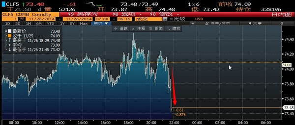 美国原油期货收跌0.40美元,报每桶73.69美元,盘后交易中一度触及73.30美元。