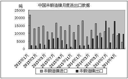 海关数据显示,10月中国进口未锻造镍(精炼镍+合金)4485吨,1-10月累计进口112402吨;10月中国出口未锻造镍9528吨,1-10月累计出口86669吨。