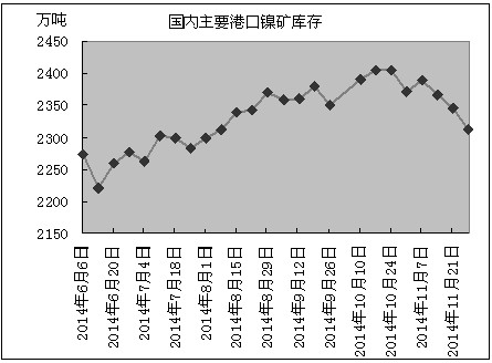 11月份国内主要港口镍矿库存出现连续减少的态势,月底库存总量为2312万吨,较10月底的2372万吨,累计减少60万吨,且从周数据情况来看,本月四个周港口镍矿库存均出现了减少。从进口源地看,不仅印尼镍矿延续了减少态势,菲律宾镍矿也开始出现趋势性减少。至月底,主要港口印尼镍矿存量为731万吨,菲律宾镍矿存量为1581万吨。