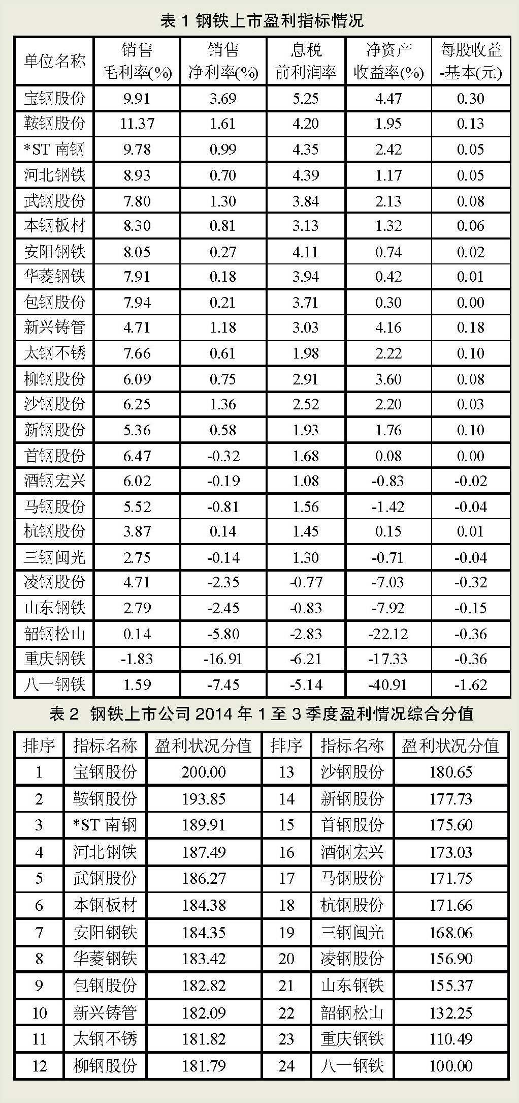 2014年前3季度SW普钢行业的平均净资产收益率为1.29%,比2013年同期下降了0.28个百分点。在24家钢铁上市公司中,有10家超过这一数值(见表1),其中宝钢股份、新兴铸管、柳钢股份净资产收益率位列前3名,均超过了3.5%。在14家低于行业平均水平的上市公司中,重庆钢铁、韶钢松山、八一钢铁净资产收益率均低于-15%,八一钢铁净资产收益率甚至降到了-40.91%。