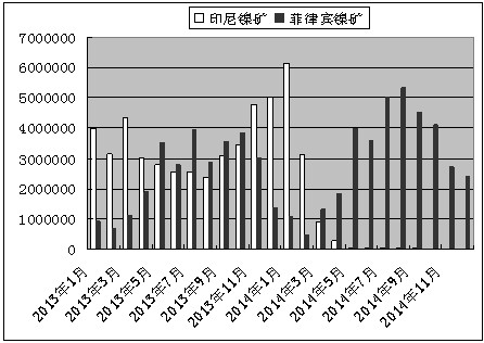 海关数据显示,2014年12月份中国共从菲律宾进口镍矿240.6万吨,较上月的273.8万吨继续减少,不过仍明显高于2013年12月份的138.8万吨,这从一个侧面说明了2014年中国进口自菲律宾的镍矿总量出现了大幅增加。