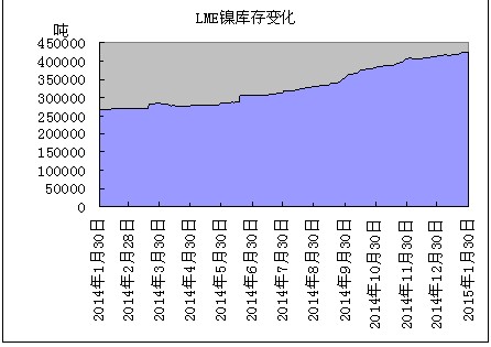 截至1月30日,伦敦金属交易所镍库存量为426243吨,较2014年12月底的413148吨增加13092吨,增加速率延续前月放缓的态势。中国海关数据显示,2014年12月份累计出口未锻压镍6521吨,虽较出口高峰期有明显的减少,但仍高于过去几年月度均值,一定程度表明,电解镍库存转移趋势虽放缓,但仍在持续。不过,春节后不久中国将进入工业活动旺季,下游需求季节性增加,预计1月份中国未锻压镍进口将出现一定程度增加,而出口则将出现一定程度减少,LME镍库存增加态势有望进一步放缓。