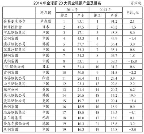 2014年美国钢铁公司粗钢产量为1970万吨,同比下滑3.4%,排名也由上年的第13位降至第15位。美国纽柯公司排名则上升一位至第13位,粗钢产量同比增长6.2%至2140万吨;韩国现代钢铁公司由于新高炉投产,粗钢产量大幅攀升19%,达到2050万吨,排名更是从上年的第18位上升至第14位,是排名前20位钢企中上升幅度最大的。