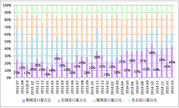 根据海关数据统计,2015年2月份我国多晶硅进口量为7558吨,环比减少18.8%,已经开始呈现减量趋势。有色协会硅业分会认为,致使2015年2月份多晶硅进口量减少主要原因是:2月份按加工贸易方式进口多晶硅4747吨,占当月总进口量的62.8%,较2014年全年加工贸易总占比减少7.7%,可见由于2014年12月31日以来以电子帐册制监管的大型进口企业的加工贸易自动关闭,加工贸易进口量呈减少趋势,随着加工贸易手册订单逐渐执行完毕,总进口量将逐渐减少并趋于稳定。但同时,2月份自美国按加工贸易方式进口占比仍高达92.1%,自韩国进口量在总进口量中占比依旧高达43.5%,来自美、韩的“双反”遗留问题仍然存在。