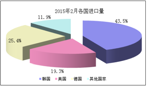 因此,硅业分会认为,2月份多晶硅进口量减少已经开始呈现“58号文件”(暂停加工贸易审批)的利好效应,是好转势头,因此在“58号文件”刚刚开始起到有利作用的关键节点,应继续严格执行此文件的具体内容,堵住加工贸易进口漏洞,同时在年度复审的重要节点重新慎重考虑韩国税率过低对国内多晶硅光伏产业造成的严重冲击,将对韩国征税提高至合理范围内,封堵韩国进口漏洞。只有封堵这两大漏洞,才能有效缓解过倾销对国内多晶硅产业造成的巨大冲击。据2月份分国别进口数据显示,自韩国、美国、德国三国共进口多晶硅6662吨,占总进口量的88.1%,其中从韩国进口量为3286吨,占总进口量的43.5%;从美国进口量为1456吨,占总进口量的19.3%;从德国进口量为1920吨,占总进口量的25.4%;其他地区进口量为896吨,占总量的11.9%。