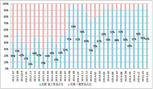 二、2月份自美国进口多晶硅1456吨,环比减少13.5%,但其中按照加工贸易方式进口量达1341吨,占当月从美国进口总量的92.1%,依然是加工贸易占绝对主导地位。自美国按加工贸易方式进口占绝对主导地位的现象始于2013年7月“双反”立案后的8月份,之后加工贸易规避“双反”的策略一直屡试不爽,从不间断,因此从美国加工贸易进口一直占绝对主导地位是导致总进口量难以回归合理范围的另一重要因素。