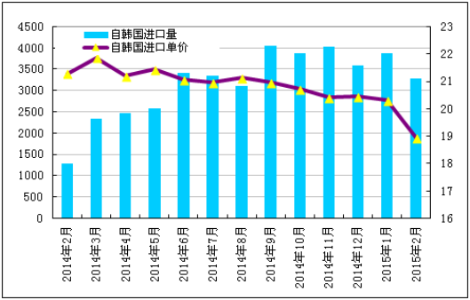 2015年2月份从韩国进口多晶硅量减少至3286吨,环比减少15.0%;2月份进口单价小幅下滑至18.95美元/千克,环比降幅为6.7%。