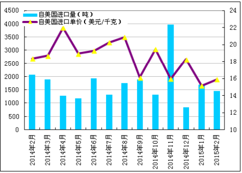 2015年2月份从美国进口多晶硅量减少至1456吨,环比降幅为13.5%;2月份进口单价微幅上调至15.90美元/千克,环比涨幅为5.0%。