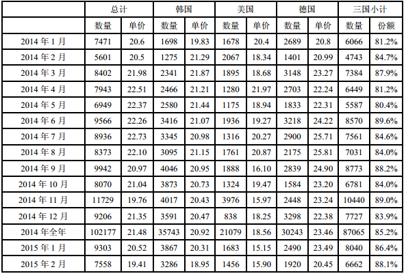 表1 2014年-2015年我国多晶硅进口情况(单位:吨、美元/千克)数据来源:海关