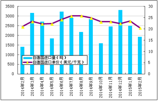 2015年2月份从德国进口多晶硅量减少至1920吨,环比降幅为22.9%;2月份进口单价小幅下滑至20.45美元/千克,环比下滑为12.9%。