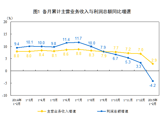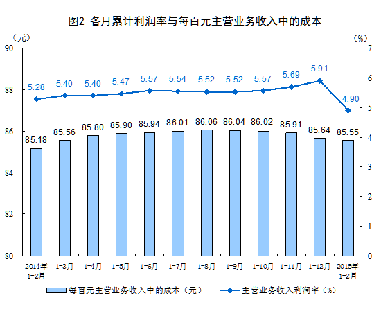 1-2 月份,规模以上工业企业实现主营业务收入 151941.3 亿元,同比增长 2.9% ;发生主营业务成本 129992.6 亿元,增长 3.3% 。