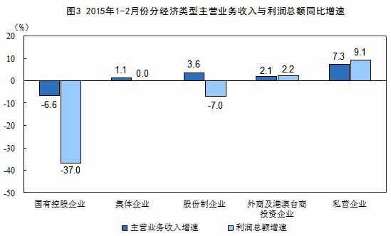 1-2 月份,在规模以上工业企业中,国有控股企业实现利润总额 1342.4 亿元,同比下降 37% ;集体企业实现利润总额 66.8 亿元,同比持平;股份制企业实现利润总额 4739.5 亿元,下降 7% ;外商及港澳台商投资企业实现利润总额 1842.7 亿元,增长 2.2% ;私营企业实现利润总额 2895.9 亿元,增长 9.1% 。