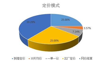而在销售主动权确立的情况下,销售方与市场贸易商的定价模式如图5所示,到港定价的占比为39.29%,出厂定价与网价结算的占比均为25%,一单一议的占比为7.17%,10天均价定价的占比为3.57%。