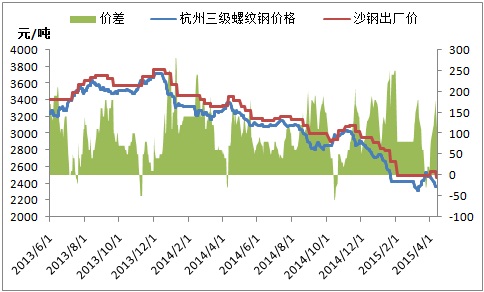 截至2015年4月13日,杭州市场20mm三级螺纹钢报2360元/吨,较上月同期基本持平。一个月以来杭州市场螺纹钢价格先扬后抑,近三周累计下跌170元/吨。为让利市场,沙钢无奈下调4月中旬螺纹钢价格80元/吨至2470元/吨,创下年内新低,不过仍较杭州市场同规格品种高出110元/吨。