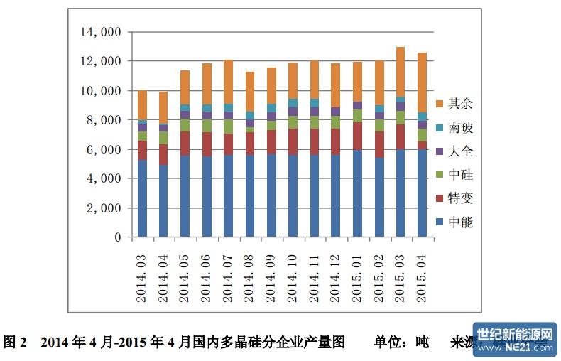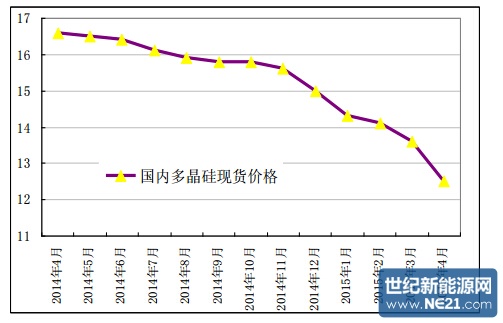 2015 年 3-4 月份国内多晶硅价格一路直线下跌,从 3 月初的 13.9 万元/吨下滑到 4 月底的 12.0 万元/吨,下降幅度为 13.7%。