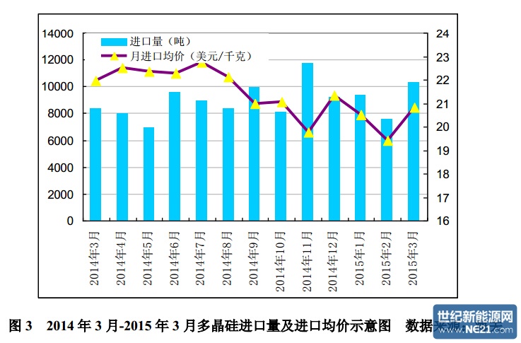 根据海关数据统计,2015 年 3 月份我国多晶硅进口量为 10297 吨,环比大幅增加 36.2%。一季度累计进口多晶硅 27164 吨,同比增加 26.5%。有色协会硅业分会认为,致使 2015 年 3 月份多晶硅进口量大幅增加至过万的主要原因有: