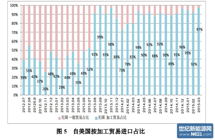 二、3 月份自美国进口多晶硅 1572 吨,环比增加 8.0%,但其中按照加工贸易方式进口量达 1530 吨,占当月从美国进口总量的 97.3%,几乎全部通过加工贸易方式进入国内。自美国按加工贸易方式进口占绝对主导地位的现象始于2013 年 7 月“双反”立案后的 8 月份,之后加工贸易规避“双反”的策略一直屡试不爽,从不间断,因此从美国加工贸易进口一直占绝对主导地位是导致总进口量居高不下的另一重要因素。