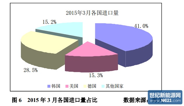 按贸易方式来分,2015 年 3 月份我国一般贸易方式进口多晶硅为 3842 吨,占比为 37.3%,加工贸易等方式进口 6454 吨,占比为 62.7%。分国别具体看来:
