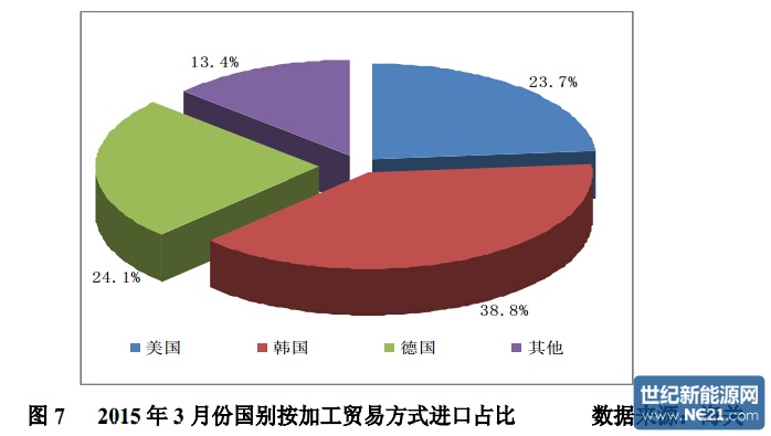 进口总量的 97.3%,一季度累计自美国按加工贸易进口占比为 95.7%,其余从一般贸易渠道进口的为不受“双反”影响的半导体多晶硅;3 月份自德国按加工贸易方式进口多晶硅 1554 吨,占自德国进口总量的 52.9%,一季度累计自德国按加工贸易进口占比为 46.3%。虽然自韩国按加工贸易方式进口占比相对美国和德国都低,但由于其总进口绝对量大,故自韩国通过加工贸易方式进口量 2505吨在总加工贸易量中占比也是最大,达到 38.8%,接近四成的加工贸易进口量来自韩国。美国虽然总进口量相比韩国和德国低,但加工贸易进口绝对量在总加工贸易进口量中也仅次于韩国,占比达到 24.1%。