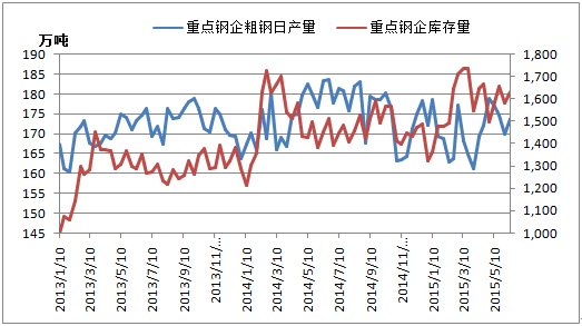 从5月份主要下游用钢行业产销数据来看,国内钢材需求增速进一步放缓。2015年1-5月全国固定资产投资同比增长11.4%,增速较1-4月下滑0.6个百分点。其中,基建投资同比增长18.1%,增速回落2.3个百分点;房地产开发投资同比增长5.1%,增速回落0.9个百分点。由于南方梅雨季节及地方财政紧张,短期内基建投资仍将受到拖累。而楼市销量回暖并未传导至中游钢铁业,主要是城市间分化加剧,一线城市房价涨幅扩大,二线城市房价稳定,三线城市房价仍然下降,房地产投资增速仍处于底部区域。