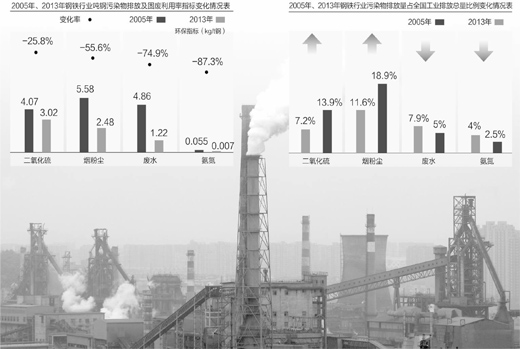 不过总体上看,钢铁业仍难摆脱高耗能、高污染的色彩。“‘十一五’以来,钢铁工业的废水和固体废弃物排放量在全国工业排放总量中的占比有所下降,但二氧化硫、烟粉尘等大气污染物的占比却大幅上升,废气治理不容乐观。”李新创告诉记者,2005年钢铁业的二氧化硫、烟粉尘排放量在全国工业行业排放总量中所占比例分别为7.2%和11.6%,而到了2013年,比重已分别扩大至13.9%和18.9%。此外,终端能源消费量则占工业行业总量的26.8%,能效相比国际先进水平也有近10个百分点的差距。